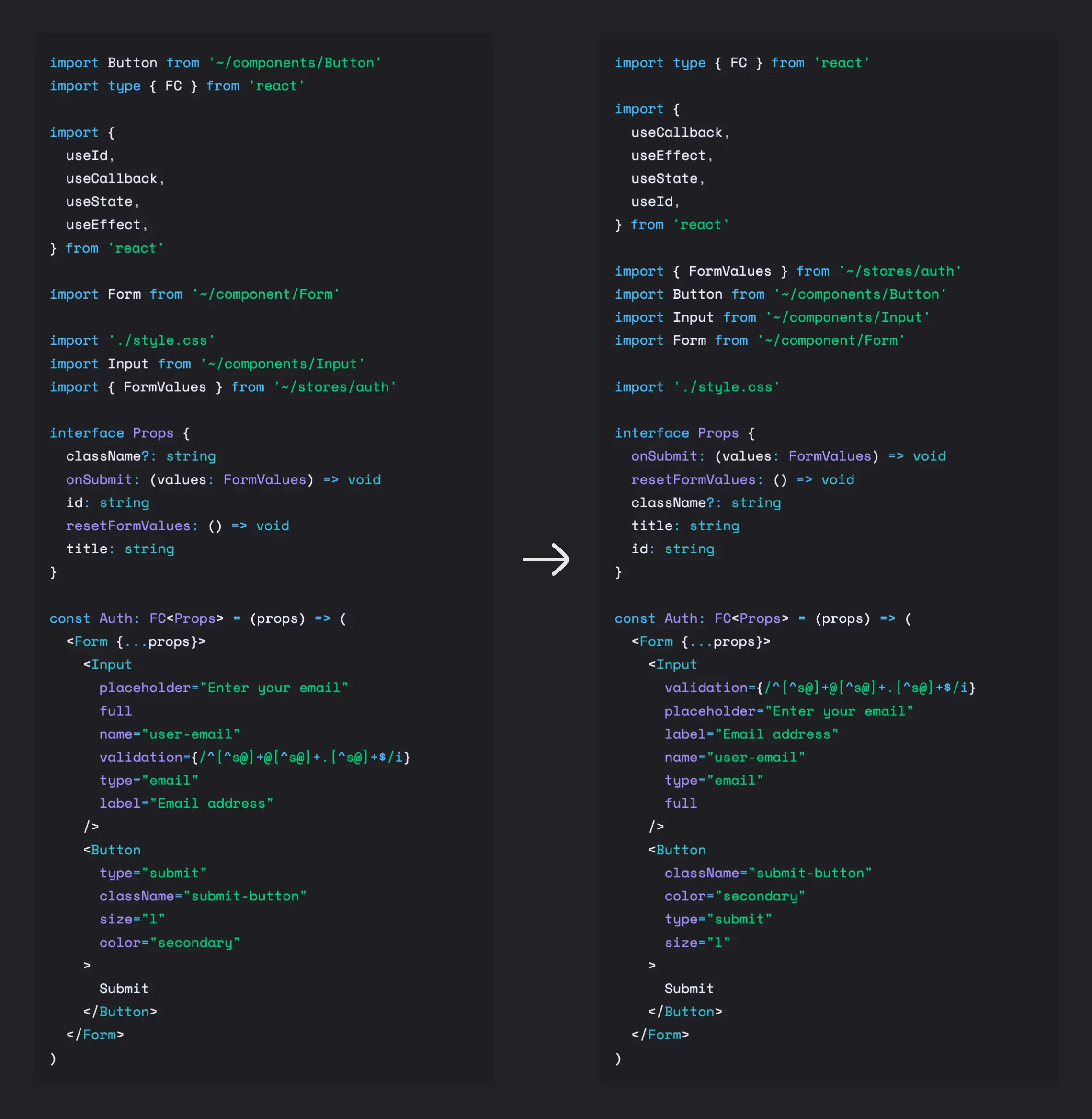 Perfectionist 4: ESLint Plugin for Sorting Things in Your Code — It doesn’t care what you want to sort (props, imports, types, decorators, modules..) but if you want to enforce something is sorted using ESLint, this is for you. It supports alphabetical and natural sorting, plus sorting by line length which results in this sort of aesthetic.